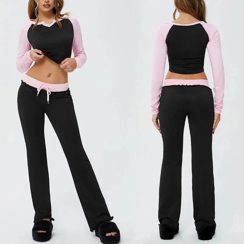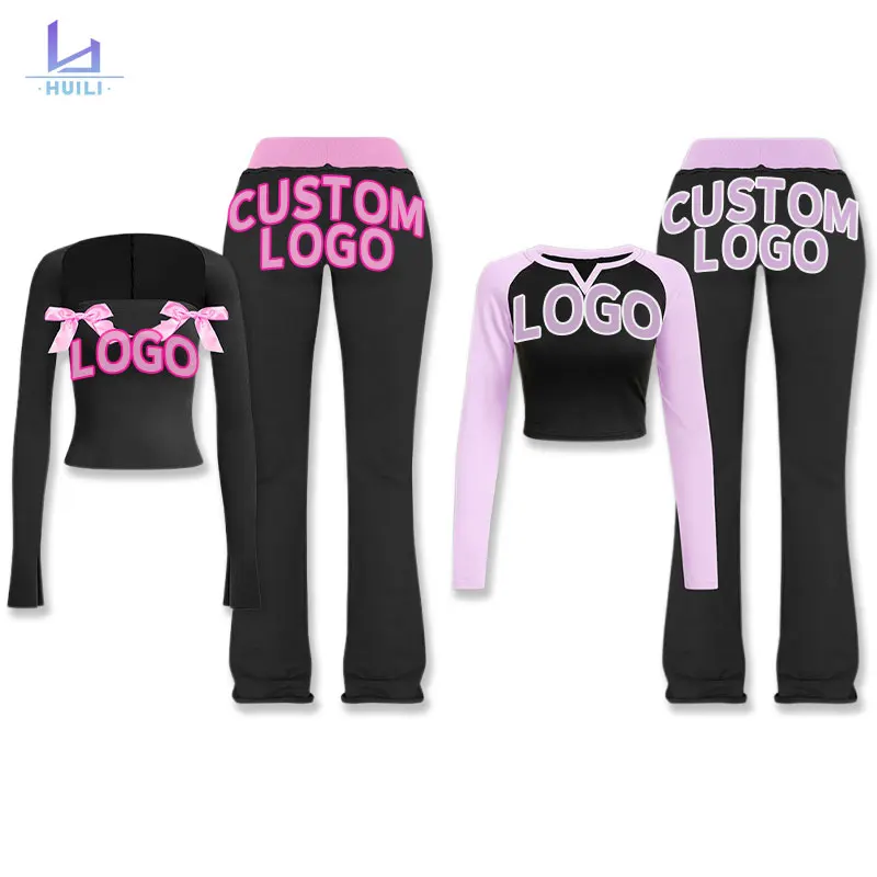 Huili Oem High Quality Custom logo Color Block Sports Pants & Long Sleeve Ctopped Top Two Piece Cotton Loungewear Women Sets